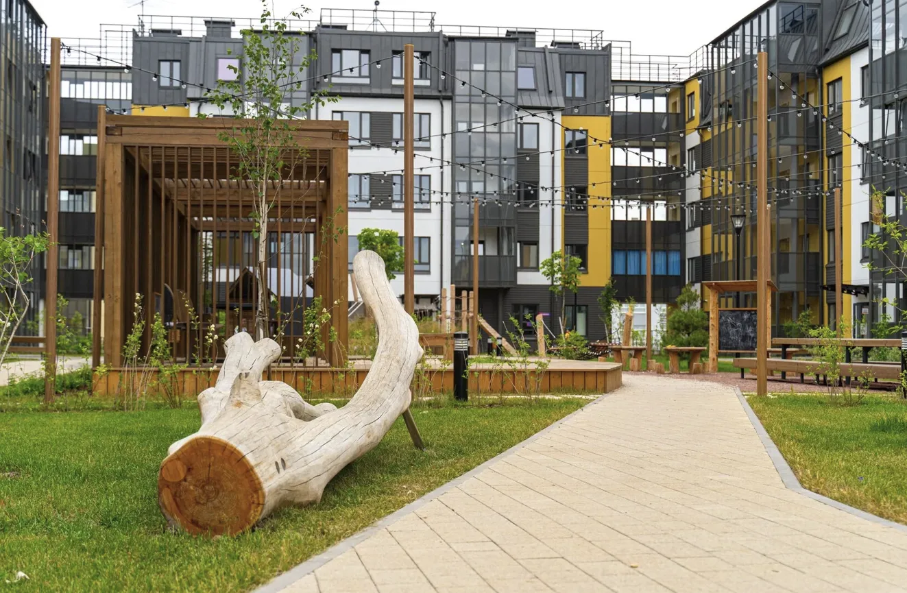 Природа не остаётся за пределами микрорайона, а нежно вплетена в его ткань. Деревья, цветники, птицы, использование естественных материалов – всё это создает атмосферу здоровой и живой среды.