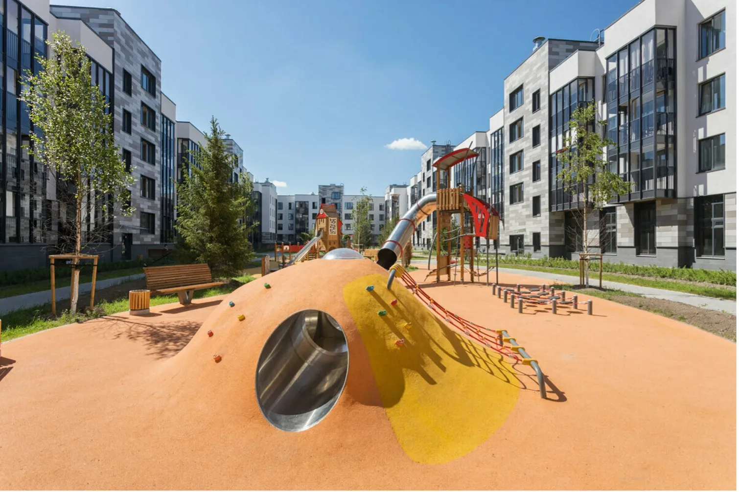 Для самых маленьких важны простота и безопасность. Им подходят небольшие горки, мягкие покрытия, разнообразные текстуры для развития сенсорики, а также устойчивые конструкции с закруглёнными углами, соразмерные их росту и возможностям.