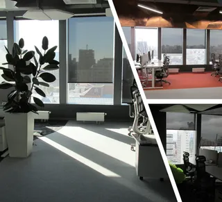 Затеняющие устройства В солнечные дни сотрудники бизнес-центра имеют возможность опустить рулонные шторы для защиты от бликов. Шторы надежно защищают глаза от прямого солнечного света, но при этом не мешают наслаждаться прекрасным видом из окна, так как они светопрозрачные.