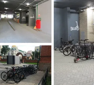 Велопарковки В бизнес-центре имеются специально оборудованные парковки для велосипедов и самокатов. Предусмотрены удобные места для хранения как в парковке, так и на территории у входа.