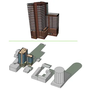 На первом этаже находятся помещения выставочных залов, офисов и минимаркет. На 2-5 этажах расположена автостоянка для посетителей. С 6 по 20 этажей — офисы под аренду.