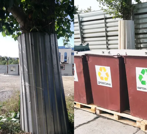 Стволы сохраняемых деревьев были защищены от строительной техники ограждениями из профлистов.