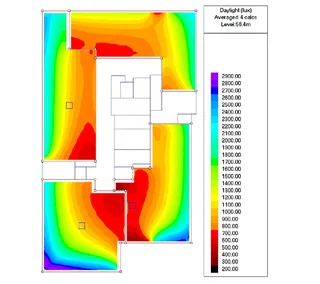 Естественная освещенность Был проведен анализ уровней естественной освещенности в помещениях бизнес-центра. Моделирование показало, что во многих помещениях обеспечивается комфортная освещенность для выполнения рабочих задач. Высокий уровень естественной освещенности позволяет также реже включать источники искусственного света.