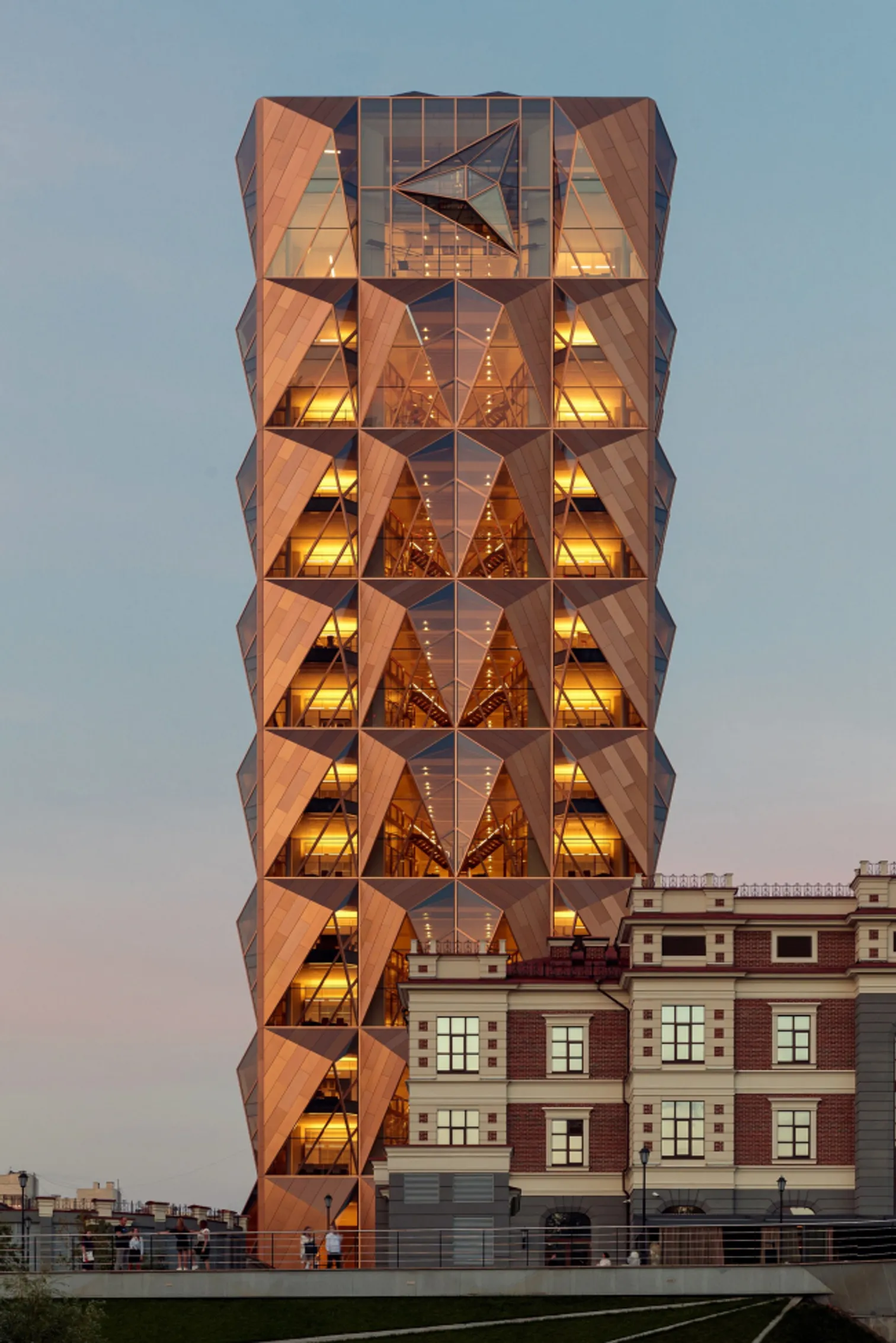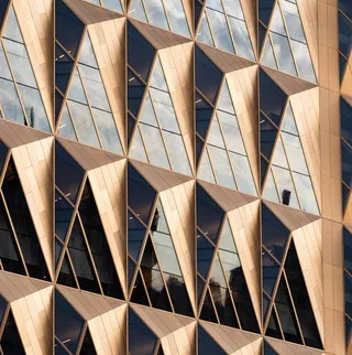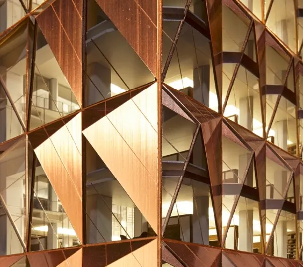 Уникальный фасад здания состоит из 196 объемных панелей, каждая из которых напоминает структуру кристаллической решетки меди. Необычная форма панели имеет разные углы наклона и подстроена специально под движение солнца в течение года. Геометрия панелей реагирует на изменения движения солнца и создает неповторимый облик здания. Так, нижняя часть панели выполнена из стекла и пропускает зимний солнечный свет в помещения. А верхняя, непрозрачная часть панели, закрывает помещения от перегрева летом.