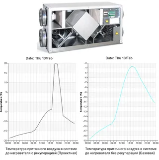 Принудительная вентиляция с рекуперацией Благодаря рекуперации энергия вытяжного воздуха используется для нагрева или охлаждения приточного воздуха с эффективностью 70-83%, что позволяет значительно повысить/понизить температуру приточного воздуха до нагревательного/охлаждающего элемента и тем самым сократить потребление энергии.