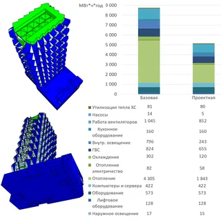 Такие инженерные решения, в совокупности с улучшенными теплотехническими характеристиками ограждающих конструкций, позволили повысить энергоэффективность здания до 41% и на 43% снизить годовые выбросы СО2 по сравнению с базовой моделью здания.