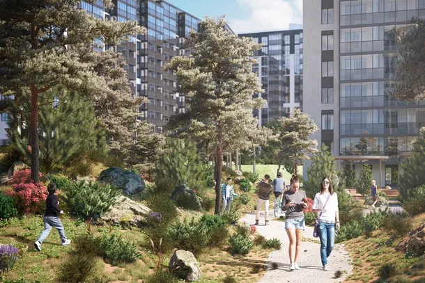 Внутренний двор – это уютное зелёное пространство, свободное от машин и с контролем доступа, а также видеонаблюдением. Всё благоустройство выполнено в скандинавском стиле, через двор можно выйти к набережной с общественным пространством. Также для комфортного времяпровождения были спроектированы несколько досуговых зон, как на открытом воздухе, так и внутри помещений, где все предусмотрено для проведения мероприятий и праздников.