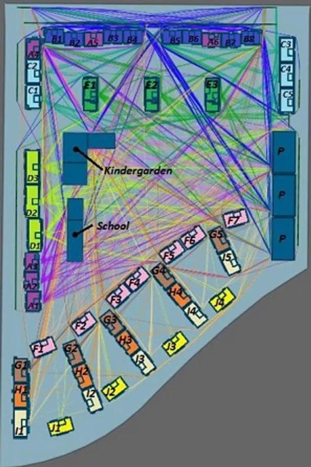Моделирование людских потоков на внутренней территории жилого комплекса проведено с целью оценки качества организации внутренней территории и ее оптимизации. Результатом исследования является выявление и анализ проблемных мест в организации внутренней территории жилого комплекса, а также карта маршрутов свободного движения людей.