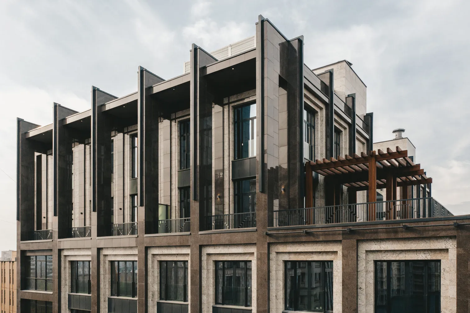 «Оливковый дом» располагает просторными квартирами и пентхаусами с большими окнами, лоджиями, потолками до 4 м, входными дверями высотой 2,4 м, ванными с окнами и дровяными каминами в пентхаусах.