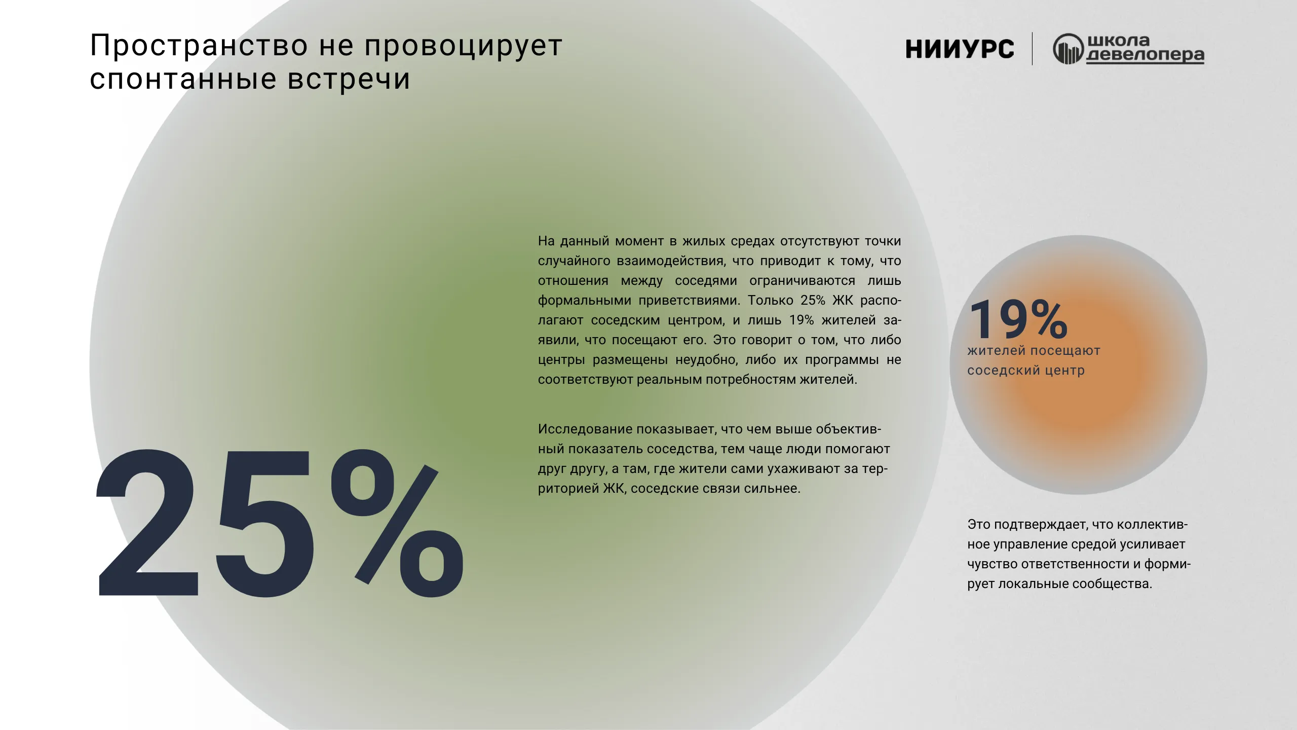 Проблема в том, что пространство не провоцирует спонтанные встречи: в жилых средах отсутствуют точки случайного взаимодействия. Только 25% ЖК располагают соседским центром и лишь 19% жителей заявили, что посещают его.