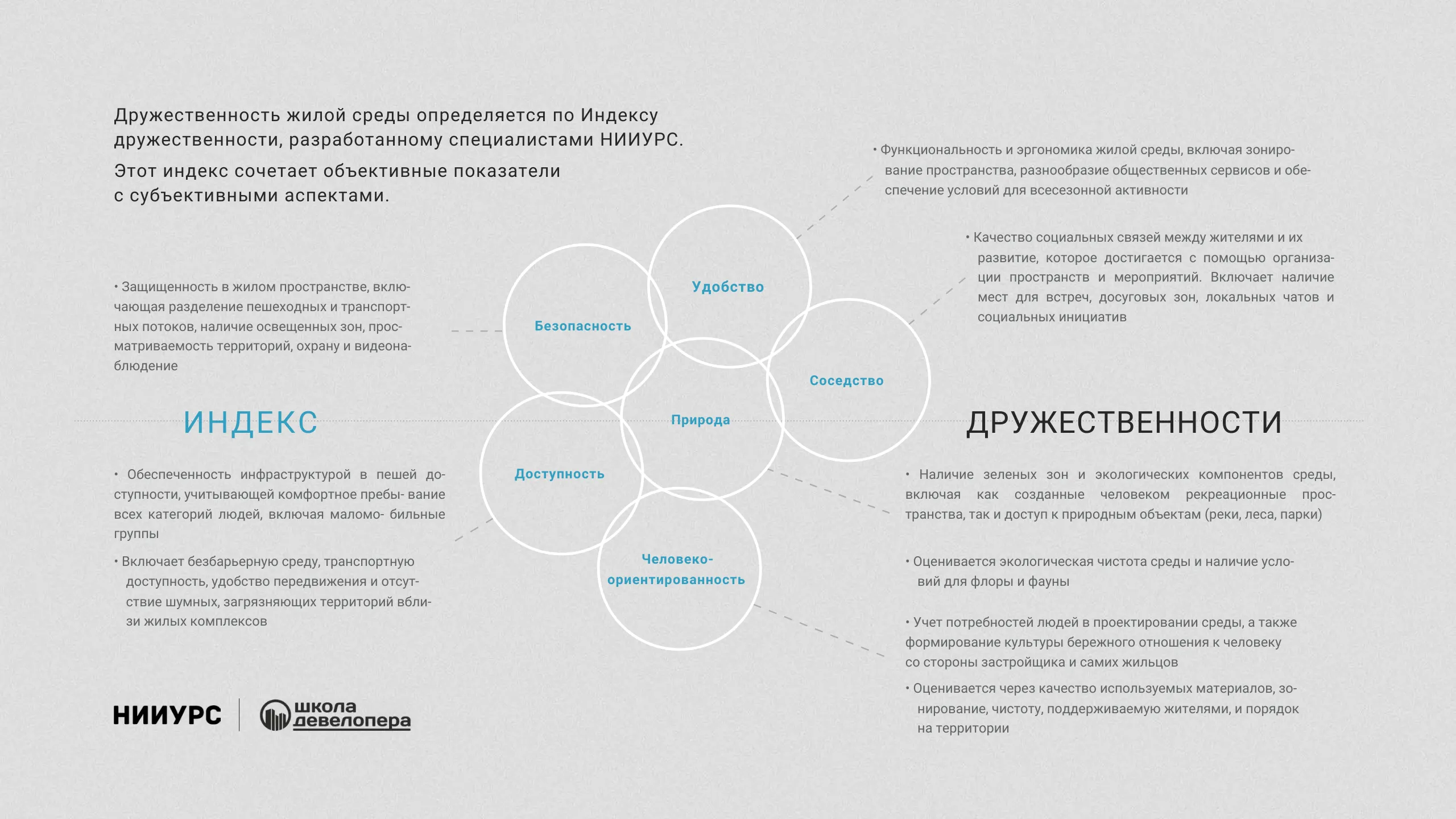 НИИУРС завершил исследование дружественности жилых сред комфорт-класса, проведенное в период с октября 2024 по март 2025 года. Наши специалисты проанализировали набор инфраструктурных решений, которые и характеризуют среду как дружественную (подробно они описываются стандартом Socio Zoom). А она, в свою очередь, определяется такими факторами, как доступность, безопасность, наличие зеленых зон и экологических компонентов, (добро)соседство и человекоориентированность. Это оценка жилой среды именно с позиций ее восприятия жителями, а также заложенных в нее смыслов.