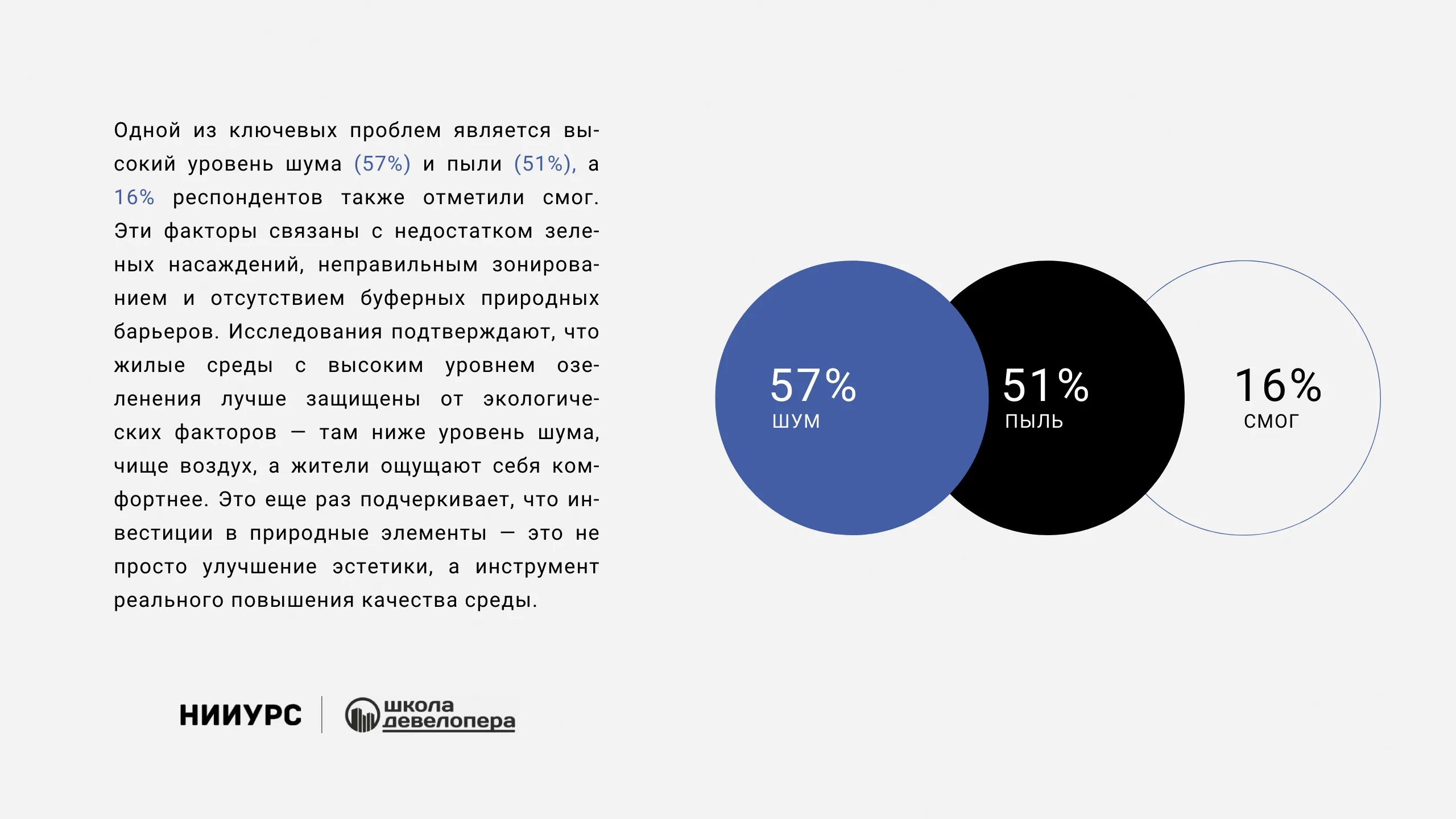 Инвестиции в природные элементы — это не просто улучшение эстетики, а инструмент реального повышения качества среды. Так, одной из ключевых проблем является высокий уровень шума (57%) и пыли (51%). Эти факторы связаны с недостатком зеленых насаждений, неправильным зонированием и отсутствием буферных природных барьеров.