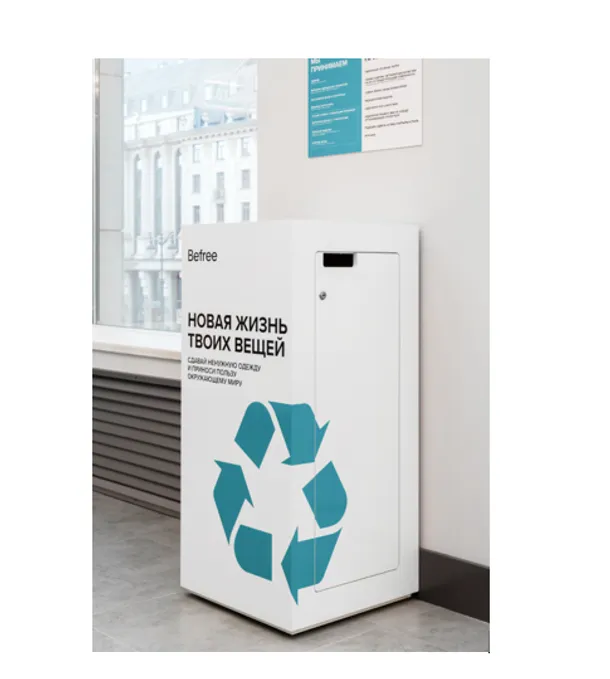 В магазине установлен ресайкл-бокс, в который каждый покупатель может сдать ненужную старую одежду. За счет последующей переработки старые вещи обретут новую жизнь, тем самым сокращая ресурсы на производство новой одежды.