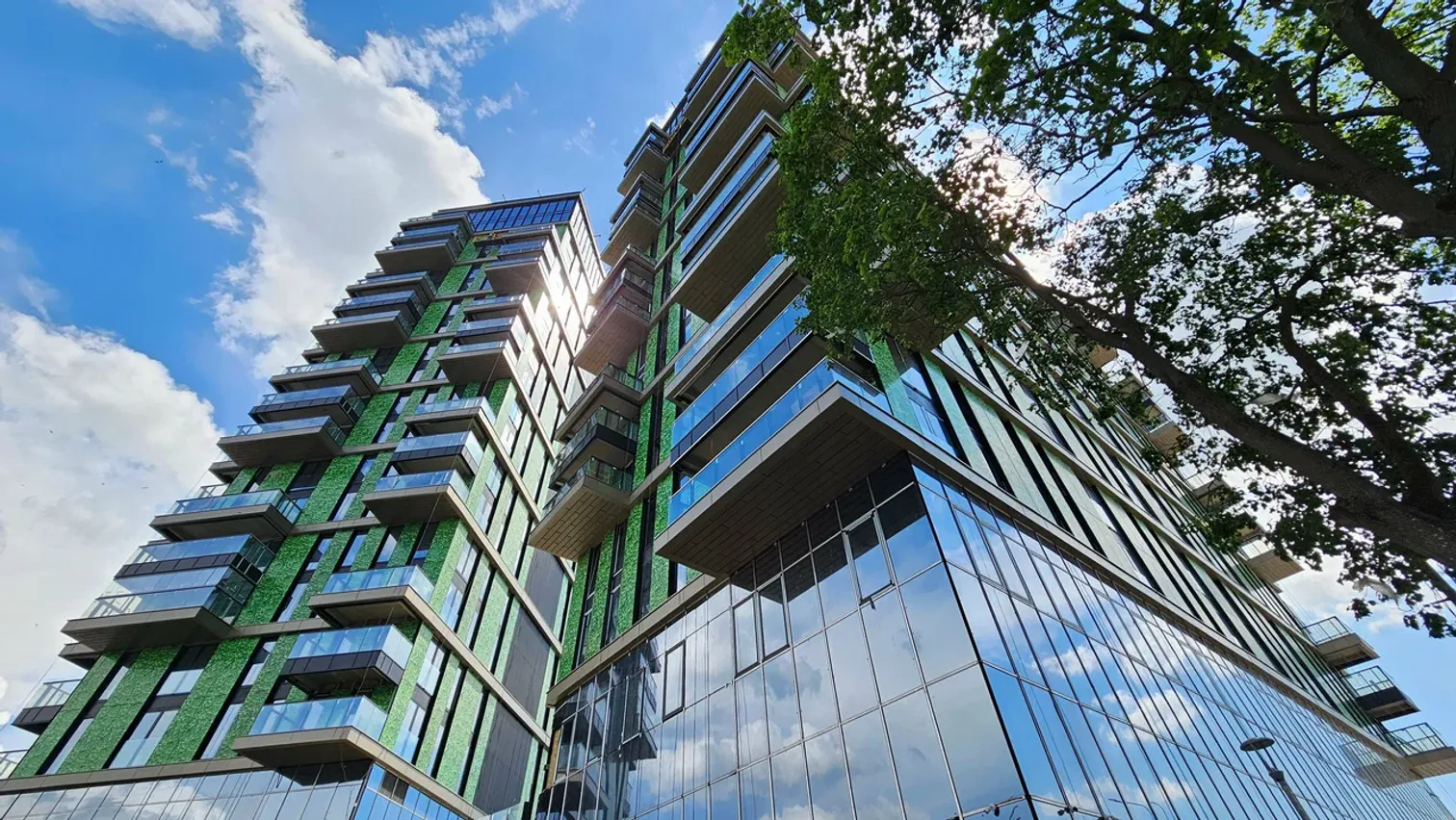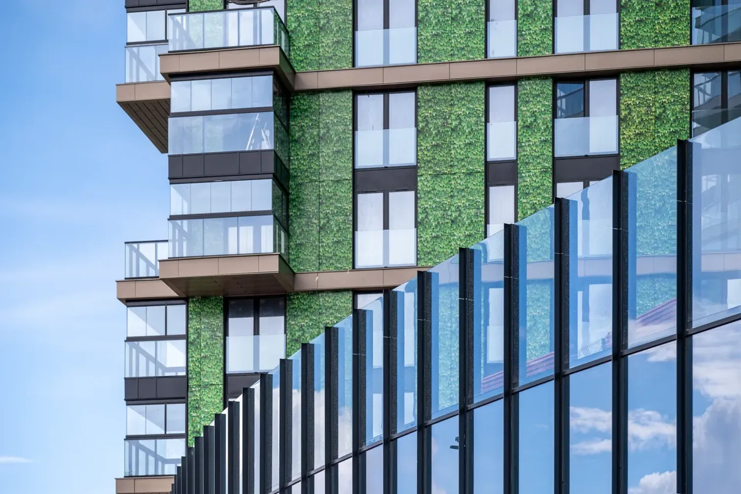 Интерьеры общественных зон включают элементы биофильного дизайна — живые растения, натуральные материалы и продуманное освещение. Для велосипедистов предусмотрены парковки и зона хранения. Комплекс сочетает энергоэффективные технологии, экологичные материалы и комфортную среду для жителей.