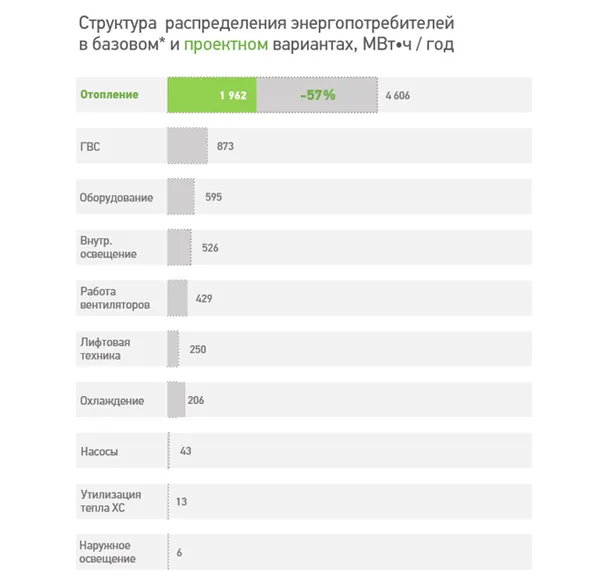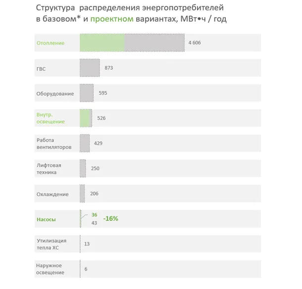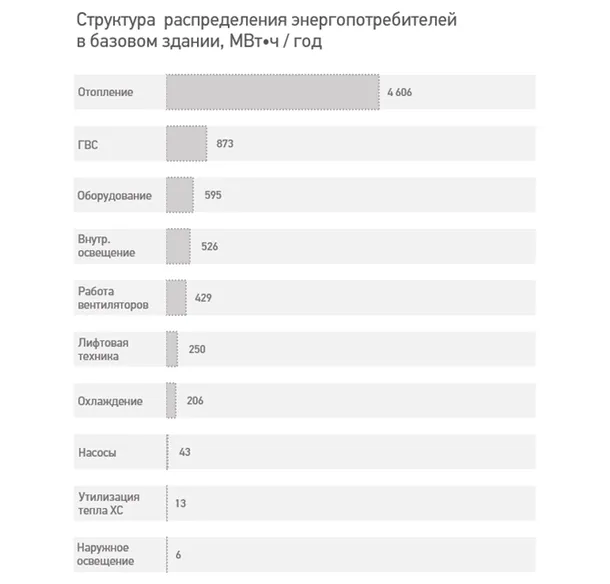 Анализ ФизтехСити, построенный в соответствии с базовыми нормативами, показал, что основными потребителями энергии выступают: