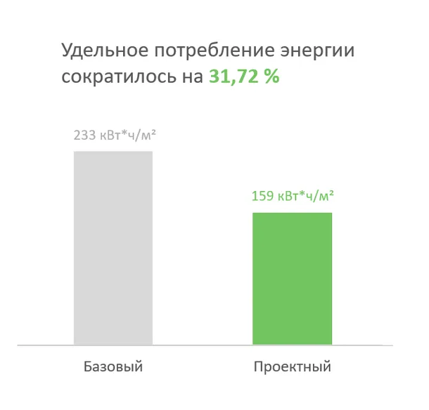 В результате применения современных энергоэффективных решений удалось снизить энергопотребление на 31,72%, оптимизировав наиболее энергоемкие направления.