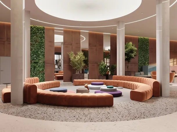 На объекте предусмотрена концепция биофильного дизайна лобби, направленная на интеграцию природных элементов и форм для создания более гармоничной и благоприятной среды для здоровья и благополучия жильцов и их гостей.