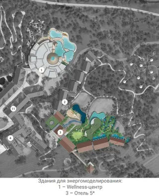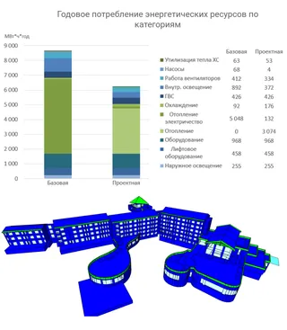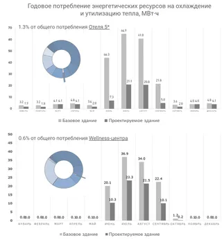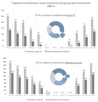 Комплексный подход к сокращению затрат На территории объектов туристской индустрии, как правило, размещается множество зданий различного назначения. Энергомоделирование помогает оптимизировать энергопотребление каждого здания в отдельности и добиться повышения энергосбережения, а, следовательно, сократить необоснованные эксплуатационные затраты при функционировании объекта в целом. Рассмотрим результаты на примере двух зданий: Оздоровительно-реабилитационного комплекса и Отеля 5*.