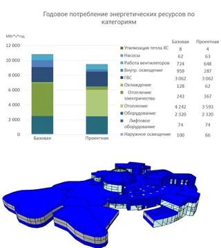Оценка энергоэффективности Энергомоделирование – инструмент, позволяющий оценить энергетическую эффективность объекта. В процессе моделирования строятся Базовая и Проектная модели: задается геометрия, окружающая застройка, нагрузки от людей, оборудования и освещения, параметры ограждающих конструкций и инженерных систем, погодные данные. Проектная модель строится по проектной документации с учетом внедренных энергоэффективных мероприятий, а Базовая – с учетом минимальных нормативных требований. На финальном этапе производится моделирование годового энергопотребления здания и его анализ с декомпозицией по разным инженерным системам. Результатом является сравнение энергопотребления в Базовой и Проектной моделях и, собственно, показатель энергоэффективности здания в числовом и процентном выражении.