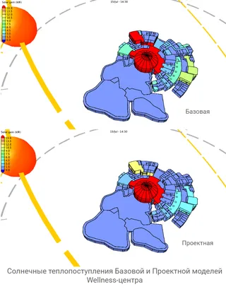 Снижение теплопоступлений от солнца На изображении показаны солнечные теплопоступления Базовой и Проектной моделей оздоровительного комплекса на дату 15 июля в полдень. Они отличаются – в Проектной модели в помещения попадает меньше солнечной радиации, поскольку коэффициент пропускания солнечной энергии проектируемого здания более чем в 2 раза ниже базового значения. Это приводит к сокращению потребности в охлаждении помещений.
