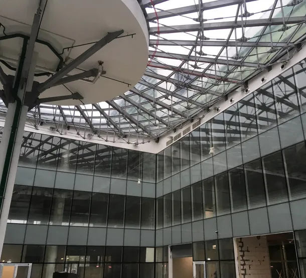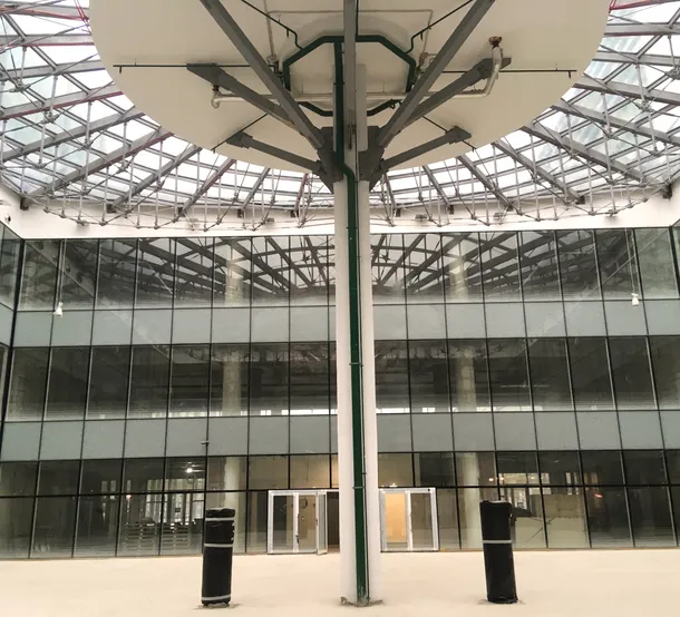 Атриум, богато залитый солнечным светом благодаря зенитному фонарю, не только обеспечивает доступ к рабочим зонам, но и является центром комплекса, вокруг которого располагаются предприятия общественного питания и торговли. Такая конструкция позволяет достичь высокого уровня естественной освещенности, снижая при этом затраты на энергию для искусственного освещения. Атриум проектировался так, чтобы обеспечить максимальное проникновение естественного света внутрь здания, в том числе и в рабочие помещения, непосредственно примыкающие к нему.