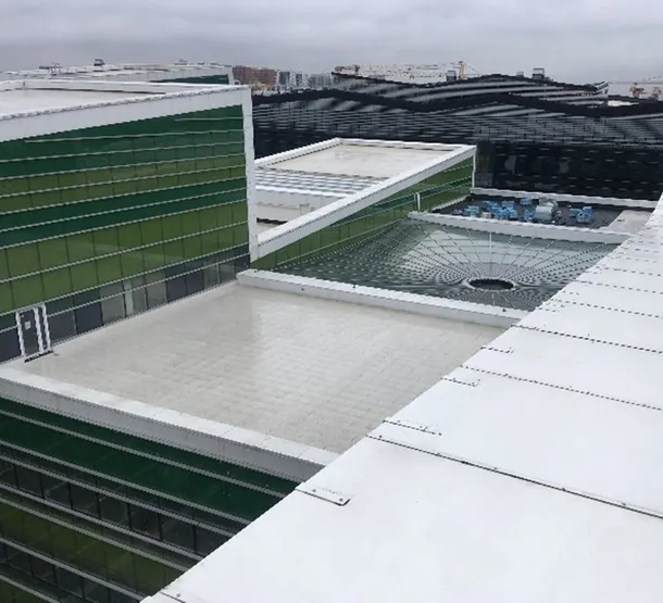 Для того чтобы снизить влияние эффекта теплового острова, были приняты следующие меры: все парковочные места для автомобилей размещены в паркинге, за исключением зоны высадки пассажиров; в качестве покрытия кровли белые материалы с показателем SRI=98, а эксплуатируемые террасы имеют покрытие из тротуарной плитки с SRI=79
