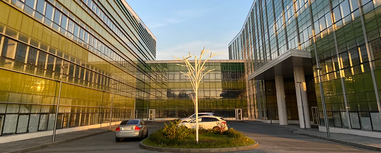 Здание НИОКР Трансмашхолдинг - это современное общественно-деловое здание. Оно объединяет исследовательские и лабораторные площади, сервисные и технические помещения. В его архитектуре отражены новейшие тенденции в области экологического и энергоэффективного строительства. Архитектура и организация пространства Архитектурный облик здания формируют скошенные профили крыш и параллельные блоки зданий, что придает ему современный и технологический вид. Центральным элементом здания является Атриум, вокруг которого организованы все рабочие пространства. Здесь расположены офисные помещения и сервисные зоны, обеспечивающие удобную циркуляцию персонала. Кроме того, в здании есть специализированные помещения для руководства с повышенной степенью безопасности и комфорта. Экологические и энергоэффективные решения Комплекс использует передовые энергоэффективные и экологические решения для уменьшения вреда окружающей среде. Центральный атриум обеспечивает проникновение естественного света внутрь здания, снижая энергопотребление на искусственное освещение. Зеленые насаждения получают необходимую им влагу с помощью системы капельного полива, а дождевые стоки с кровли собираются и очищаются для технических нужд от мытья тротуаров до нужд полива, что помогает уменьшить нагрузку на городскую канализацию. Парковка и транспорт На территории здания предусмотрена двухуровневая парковка на 350 мест, а также специальный VIP-паркинг на 20 мест. На уровне первого этажа организована зона высадки-посадки пассажиров на 10 мест. В паркинге установлены зарядные станции для электромобилей.