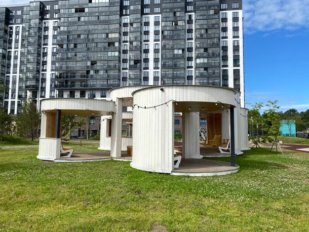 На замкнутой территории для создания привлекательной среды необходимо создание крепких социальных связей. Предпосылки для этого возникают с созданием соседского центра с возможностью доступа в теплые помещения и залы в течение дня, многофункционального павильона с навесом на открытом воздухе, в которых предоставлены возможности для различных активностей (проведение домашних ярмарок, праздники, собрания, встречи).