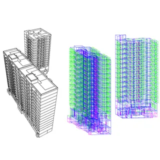 Создание модели начинается с геометрии. Здесь учтены объемно-планировочные решения оцениваемого здания. На этом этапе также была построена окружающая застройка. Важной особенностью при построении геометрии являлись открытые французские балконы с окнами в пол, полностью остекленные балконы и витражное остекление коммерческих помещений первого этажа.