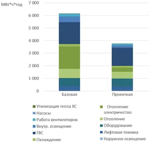 Наибольшее влияние на результат оказало использование рекуперации в приточно-вытяжных установках, что позволило сократить расходы электроэнергии в категории «Отопление электричество» более чем на 80%. Применение эффективной водоразборной арматуры не менее чем на 15% сократило потребление тепловой энергии для нужд горячего водоснабжения – ГВС. Решения, нацеленные на улучшение ограждающих конструкций и модернизацию системы отопления, отразились в категории «Отопление» сокращением в 25%.