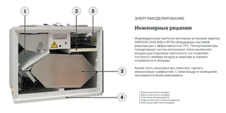 Инженерные решения Индивидуальные приточно-вытяжные установки квартир SWEGON CASA W80 и W100 оборудованы системой рекуперации с эффективностью 72%. Теплоутилизаторы поквартирных систем используют тепло вытяжного воздуха для подогрева приточного, что позволяет поступать свежему воздуху в квартиру и снижает потребности в обогреве. Кроме этого, приточные установки с рекуператором помогают сделать микроклимат комфортнее. С ними воздух в помещении прогревается более равномерно.