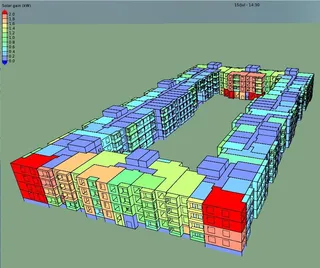 В результате моделирования мы получаем большое разнообразие информации об энергетических процессах в здании. Например, расчет энергии солнца, поступающей в помещения через ограждающие конструкции. На визуализации справа красные помещения получают больше солнечной энергии. Фиолетовые – меньше.