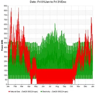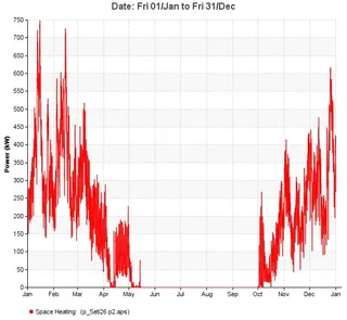 Модель позволяет еще на стадии проектирования оценить годовые затраты объекта на тепловую и электрическую энергию. Для этого пригодятся данные из модели о тепло- и электропотреблении в течение года. На графике справа красная линия отображает потребление тепловой энергии. Зеленая линия – потребление электроэнергии.